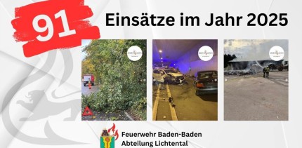 Das Jahr 2025 bescherte der Abteilung Lichtental 91 Einsätze. Damit lagen wir leicht über den Einsatzzahlen des Jahres 2024 (87). Wir bedanken uns an dieser Stelle bei unseren Aktiven der Einsatzmannschaft für ihr Engagement, bei allen Unterstützern und Helfern. Bereits in der ersten Stunde des neuen Jahres 2026 hatten wir zwei Einsatzstellen abzuarbeiten. Daher werden wir nicht nachlassen, die Bürger unserer Stadt zu schützen - 24 Stunden, 7 Tage die Woche.